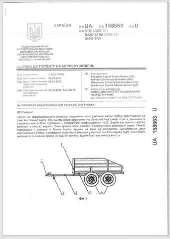 Причіп до квадроцикла для евакуації поранених : пат. 158663 Україна : MПK (2025.01) : B62D 63/06 (2006.01) : B60G 5/00. № u 2024 02994 ; заявл. 06.06.2024 ; чин. 06.03.2025 ; опубл. 05.03.2025, Бюл. № 10. 5 с.